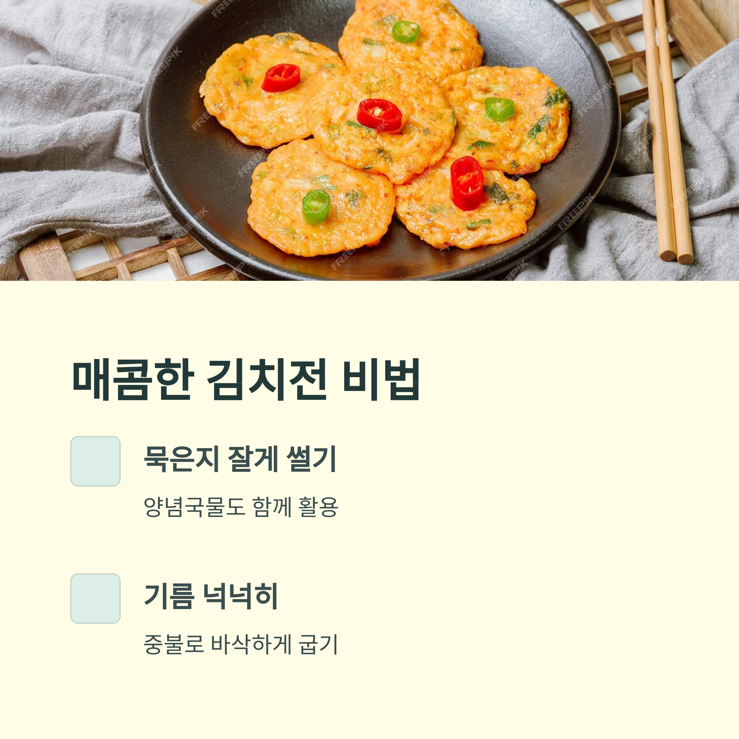 - 김치전: 묵은지와 양념 국물까지 활용해 매콤하고 바삭하게